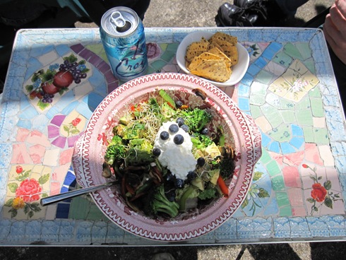 Leftover romaine, craisins + walnuts from last night plus sauteed broc, peppers, mushrooms, plus cottage cheese, sprouts, avocado and blueberries.