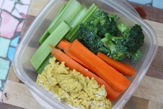 Celery, broc and carrots with about 1/3 cup of my Curry Honey Coconut Hummus