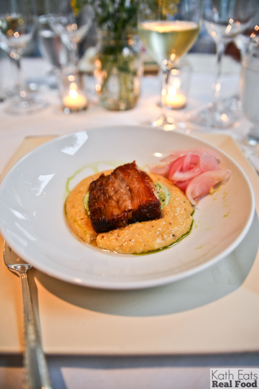 Our first course was honey-glazed pork belly over chipotle grits with cilantro cream (pickled onions on the side!). Paired with the 2014 Viognier. This was my favorite course!