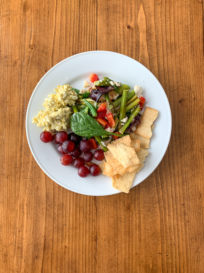 Haha for a minute I was like “Whaattt??” It’s just leftover grilled asparagus, green beans, red peppers, spinach, feta, and dressing! Heavy on the veggies, light on the spinach.