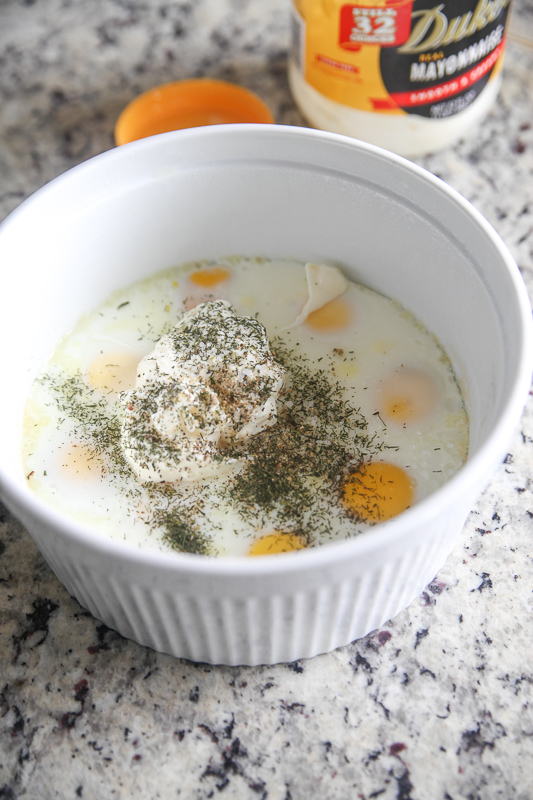 The other ingredients are simple: salt, pepper, and dried dill to taste. I measured for the recipe at 1/2 tsp dill, 1/2 tsp kosher salt and 10 grinds of black pepper. This does have a good bit of mayonnaise – a little more than 1/3 cup – but it’s perrrrrfect. Don’t fear the mayo my friends, but you can lighten it up with greek yogurt if you want, but I haven’t tried it (because Thomas the purist won’t let me!)
