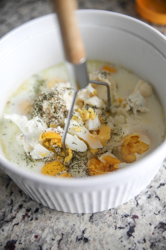 - Once slightly cool, add mayo, dill, salt and pepper and mash with potato masher until thoroughly mixed.