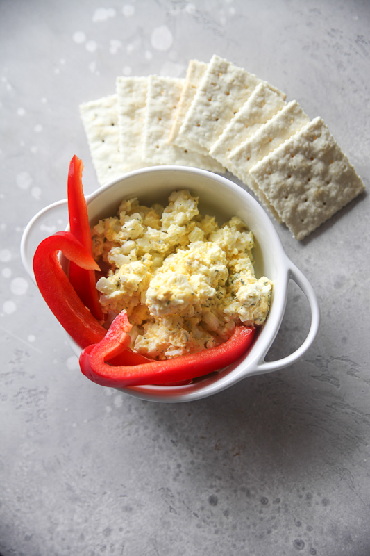 I LOVE this with saltines or pita chips, and Thomas always makes an egg salad sandwich. Scoop it up with veggies (or better yet – add some diced peppers or carrots!)
