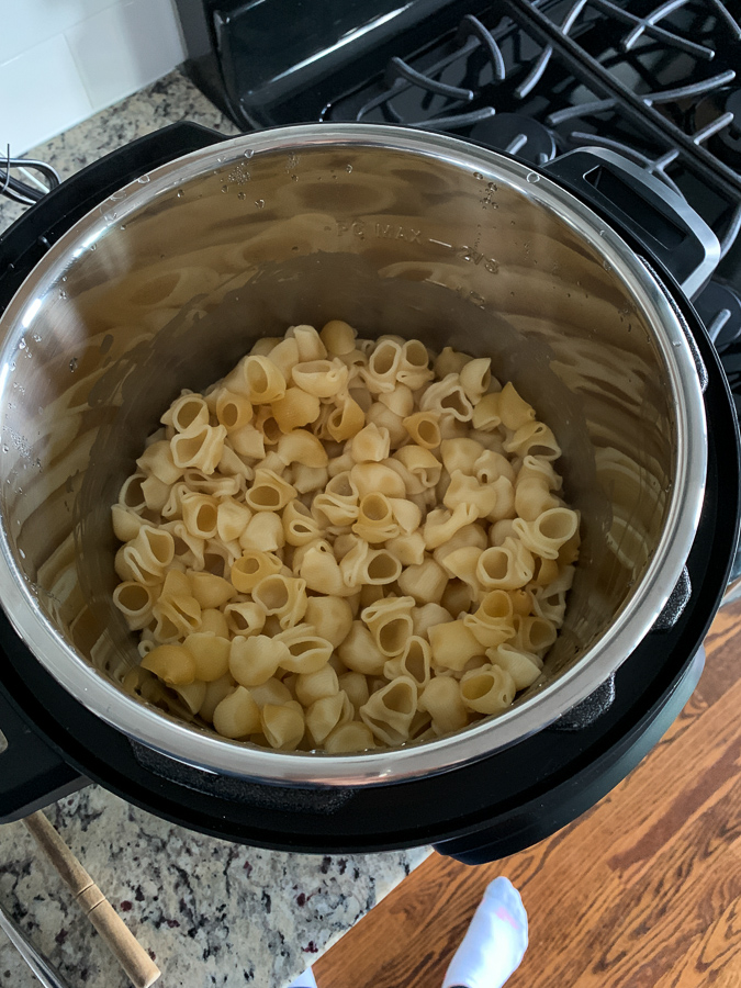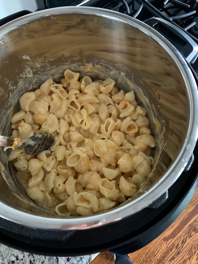 Pressure cook for 4 minutes. You can see that some of my pasta pieces were a little uncooked around the edges making them a little crunchy. But after stirring the starchy water around, adding cheese, and milk, I never noticed any crunch in the finish dish. I think they finished steaming while the mac was on warm until it was time to eat.