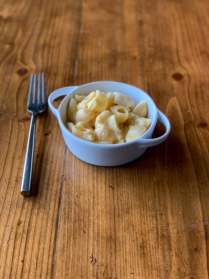 My mind was seriously blown at how easy this was. Never will I waste time draining water or squeezing out cheese sauce again! (OK I might in a pinch so don’t hold me to it…!) We had this as a side with dinner many times last week. I’d love to add some broccoli florets and/or frozen peas next time, but I have a child who doesn’t like his food mixed, so they might have to be cooked on the side.