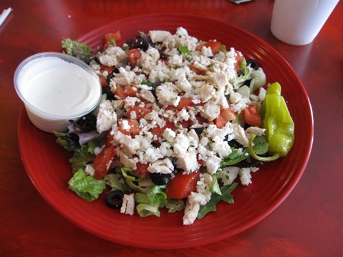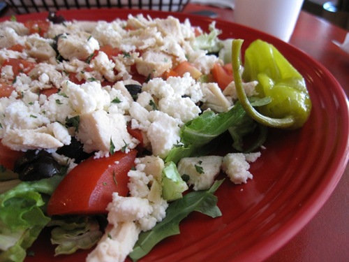 I ordered a Farmerās Fresh Salad with Chicken and no onions and found the Mediterranean Salad in front of me when our food was delivered. I was too polite and hungry to complain, so I had my second Greek salad chicken of the weekend.