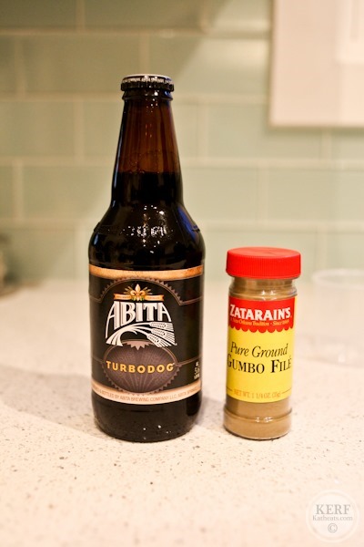 Two other key ingredients Jeff brought were Abita’s Turbodog and Gumbo Filé (pronounced “fee-lay”). The filé is ground sassafras and was used both in the dish and as a garnish on top. It smelled like Earl Gray tea!