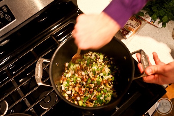 He made the roux at home because we didn’t want to eat dinner at 10pm. Gumbo is not a “easy weeknight dinner” (although the leftovers were!) Rather, it’s historically made on the weekend with all of the leftover meat bits and veggies from the week. Roux making is often described in terms of beer consumption instead of time. Jeff said his took about 2 beers to finish