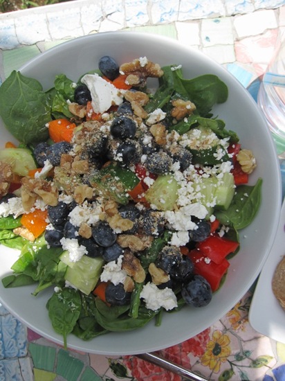 I made a delish spinach salad with cuc, carrot, peppers, blueberries, goat cheese, walnuts and a drizzle of EVOO and honey.