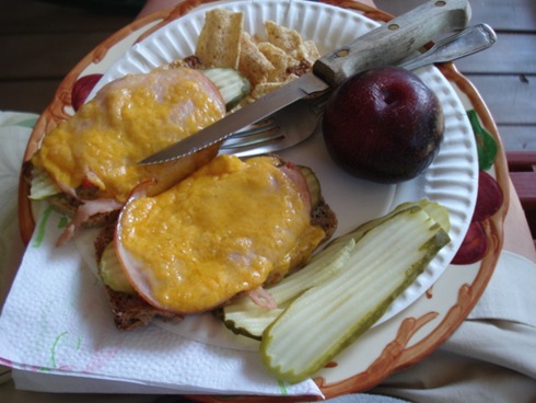 We made Turkey + Cheddar Melts with the husband’s homemade rye bread. Plus I had a plum, some sun chips, and pickles!