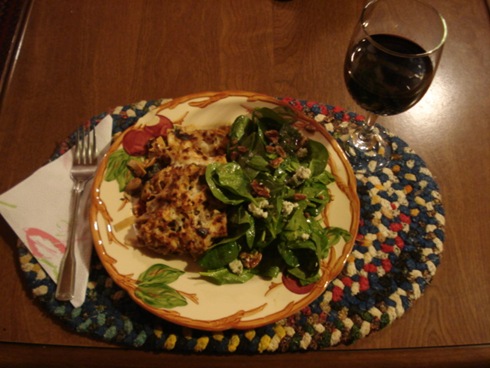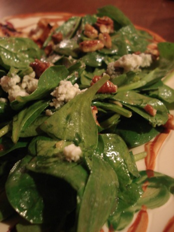 We also did a spinach salad with pecans and blue cheese in a homemade dressing. The dressing was: raspberry blush vinegar, honey mustard, honey, and salt.