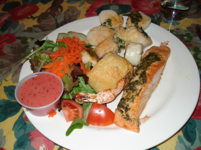 For my entree, I got the broiled seafood platter, which seemed healthy enough. It came with a side salad (fresh raspberry dressing!), a stuffed shrimp, pesto salmon, and parmesan-crusted scallops. I ate 3/4 of the salmon and 3 or 4 scallops and gave half the shrimp to my sister. Of course I ate all the salad. I also had some bites of the husband’s tuna and ate my sister’s zucchini (3 pieces). I gave the rest of my scallops and salmon to the husband. I could have easily eaten them, but I was determined to be satisfied and not FULL at the end of the meal.