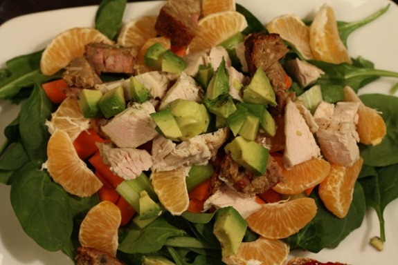 Spinach, carrot, celery, a slice of turkey, stuffing croutons, clementine and avocado. It rocked.