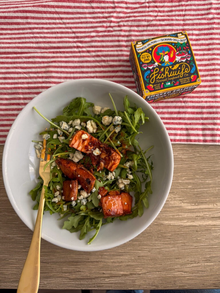 And the Fishwife hot smoked salmon was SO GOOD! It was in a sauce made with Fly By Jing sichuan chili crisps which I used for a dressing over arugula and blue cheese crumbles.