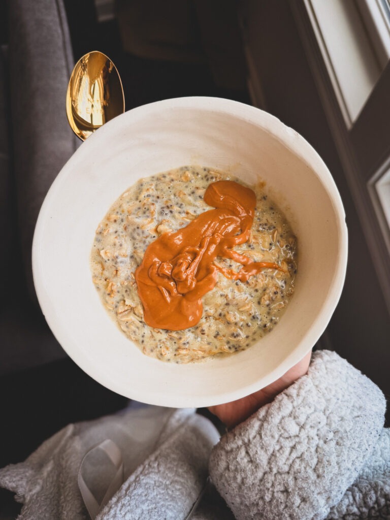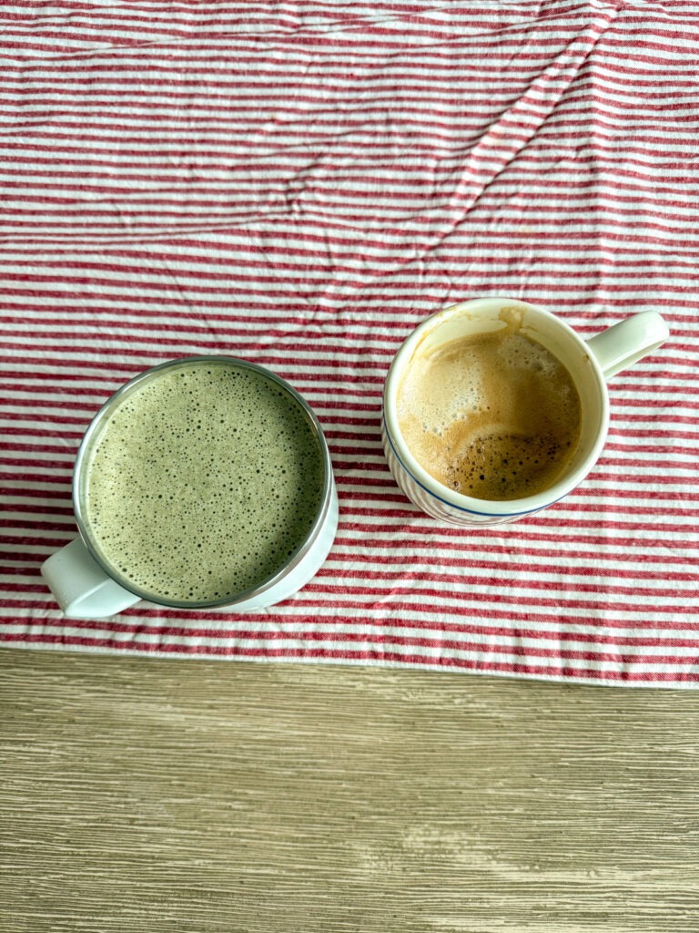 I love an all-in-one smoothie. This one had banana, spinach, whole milk, oats, chocolate whey, collagen, and a little peanut butter.
