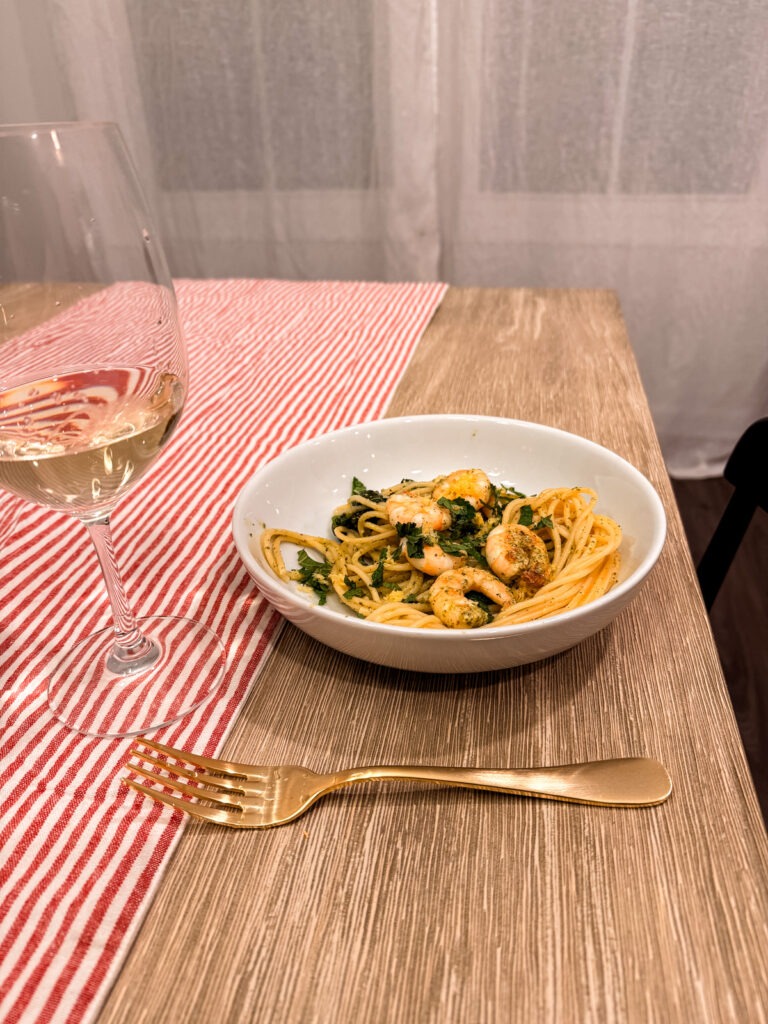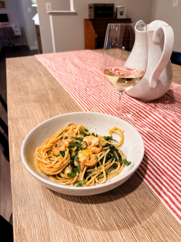 The basics are simple: spaghetti noodles, sauteed shrimp, spinach, prepared pesto and a little half and half to make it creamy. But the secret ingredients were lots of lemon zest, lemon juice, and MINT! I can’t even tell you how good the mint was. I never would have thought to add it if I hadn’t had a similar combo in Italy!