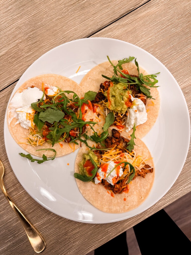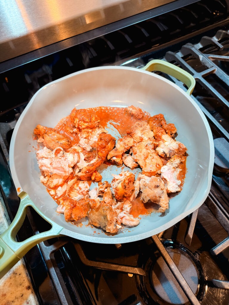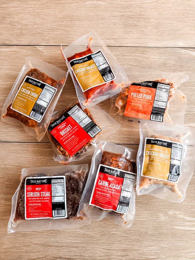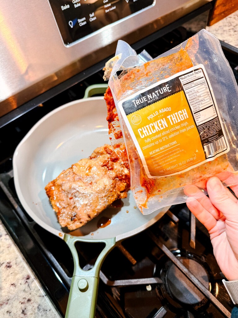 These meats come frozen and are already cooked – with delicious flavors! All you need to do is thaw them in the fridge and then heat in a pan! They have lots of different options, and most of the flavors are $11-12 each – not bad for protein for a few servings. (We got 4 servings out of ours). I cooked the Pollo Asaco chicken thighs and made tacos. Mazen and I loved!