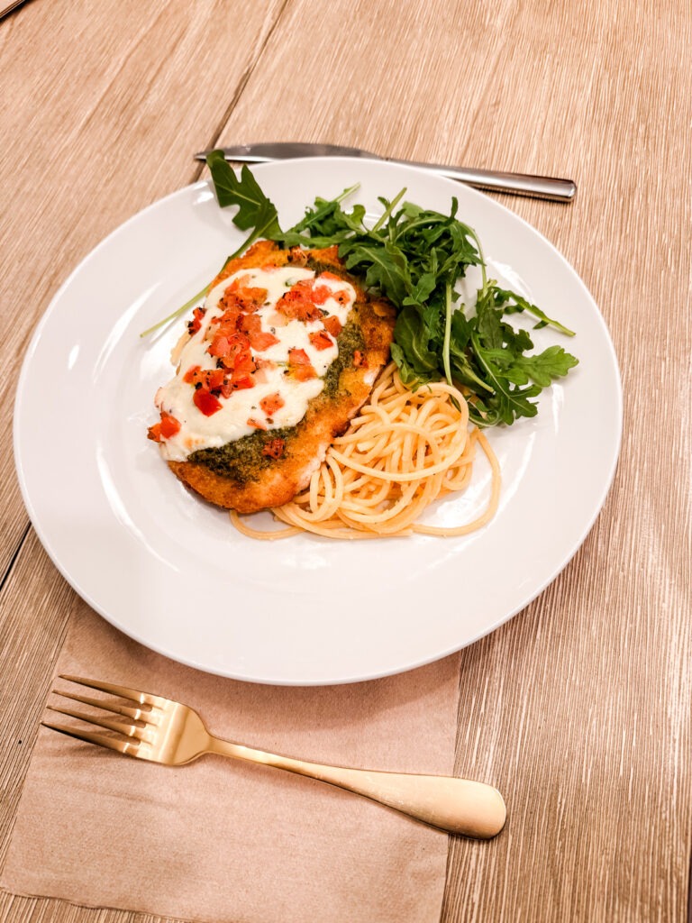 I let Mazen pick out one of the take-and-bake options at Wegmans, and he picked the chicken parm with pesto and mozzarella. We both loved this!