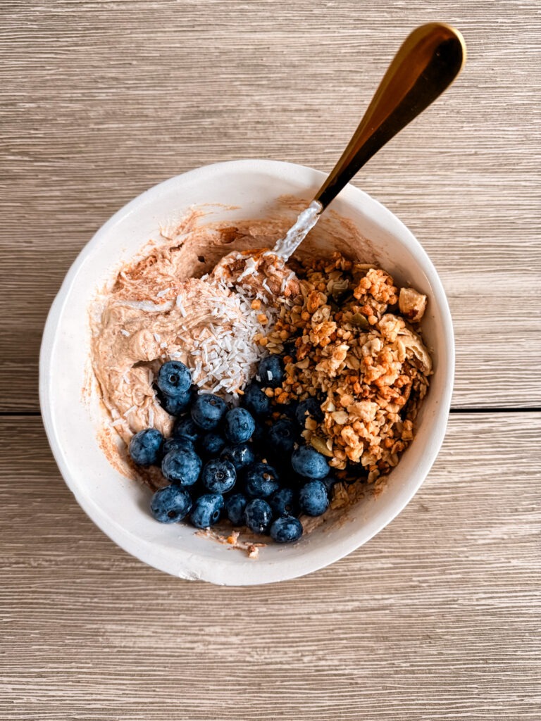 Loved this combo! I mixed 5% Fage with peanut butter and Ancient Nutrition Chocolate Whey and added coconut, vanilla granola and blueberries (gotta get fresh fruit or veggie in every meal!) It was like a PB mousse!