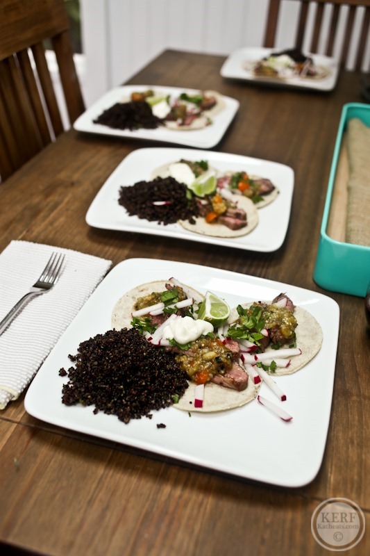 The tomatillo salsa was awesome, and both Matt and I said separately that the flavors reminded us of Mexico. He spent a whole summer there in college and can vouch for authenticity. We added a little yogurt as sour cream on top. The grain is black quinoa.