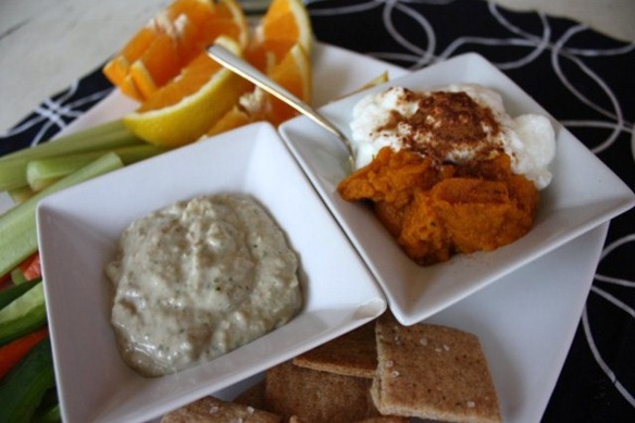 Crunchy Bright Basil Bean Dip and Pumpkin Yogurt with Cinnamon