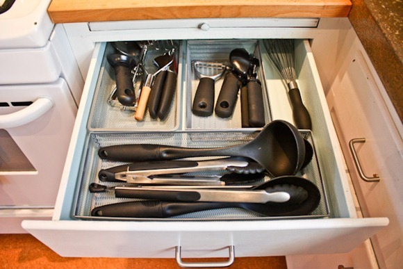 Our kitchen drawers used to be an ugly dark, stained wood. When we had the house painted upon moving in, I had our painter match the color to the living room (and if adding that on to our paint list hadn’t been so easy I would have DIYed these myself!). I smile every time I open a drawer to see the beautiful robin’s egg blue smiling back!! Of course you probably know I keep my drawers super organized : ) That’s for another post!