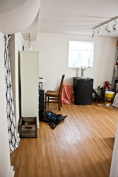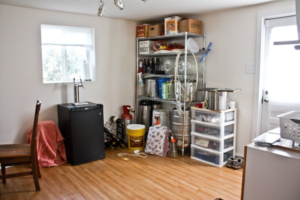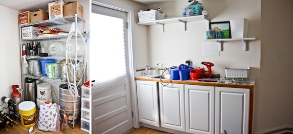 We have since cleaned up this space a bit, but you can see all of Matt’s beer equipment on the left and on the right, the shelves and cabinets house tools and paint.