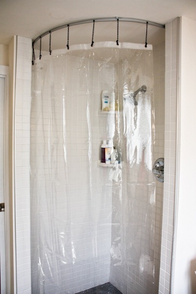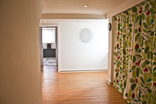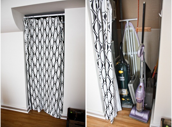 There is another closet in here that links to the furnace room where we store the vacuum cleaner, tools and gardening things since we don’t have a garage. The shower curtain makes for a funky door!
