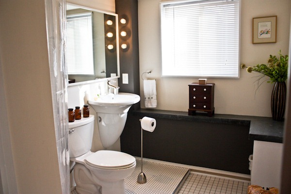 The guest/downstairs bathroom is next door. We love how modern it is with the concrete shelf and colors!