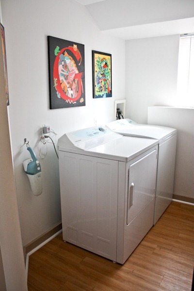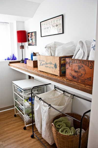 And on the right is the laundry room!! I love the vintage boxes 🙂 The cart with drawers is IKEA and the cart with canvas was here with the house (there were actually two of them and they were falling apart – I kept one to use for dirty linens that need to accumulate in order to make up a load). I keep sheets and towels in the boxes and basket below.