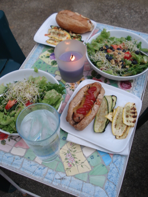 For dinner we grilled some Al Fresco Chicken Sausages . These were the sweet Italian kind, which we’d never had, and they were awesome! Very authentic sausage tasting with a great ingredients list and nutritional profile (for a sausage, that is). There’s half a slice of 2% sharp cheddar under there, but you can’t see it. It’s in an Ezekiel hot dog bun that I froze and thawed. These freeze pretty well as long as you microwave them for about 30 seconds to re-soften them.