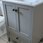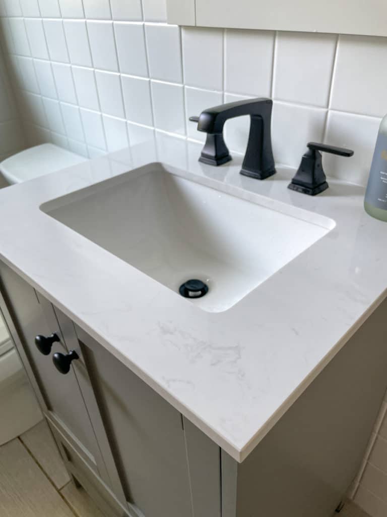 As far as bathroom remodels go, this one wasn’t bad. We were out of commission for a day in between taking out the old vanity and the plumber installing the new faucet.