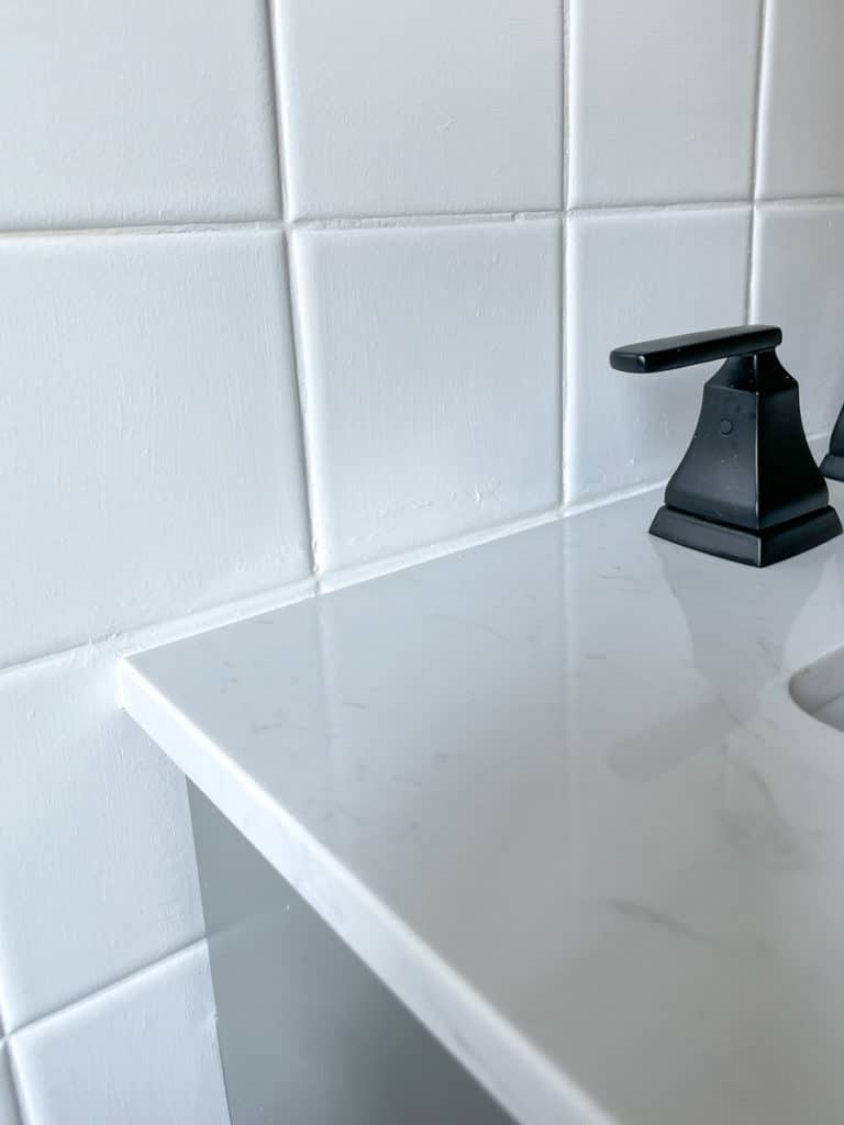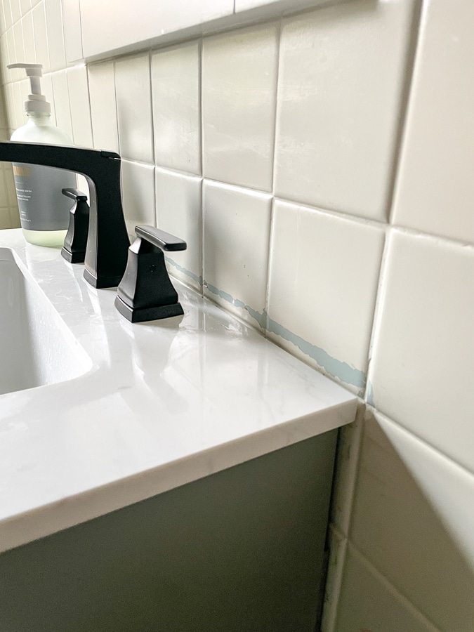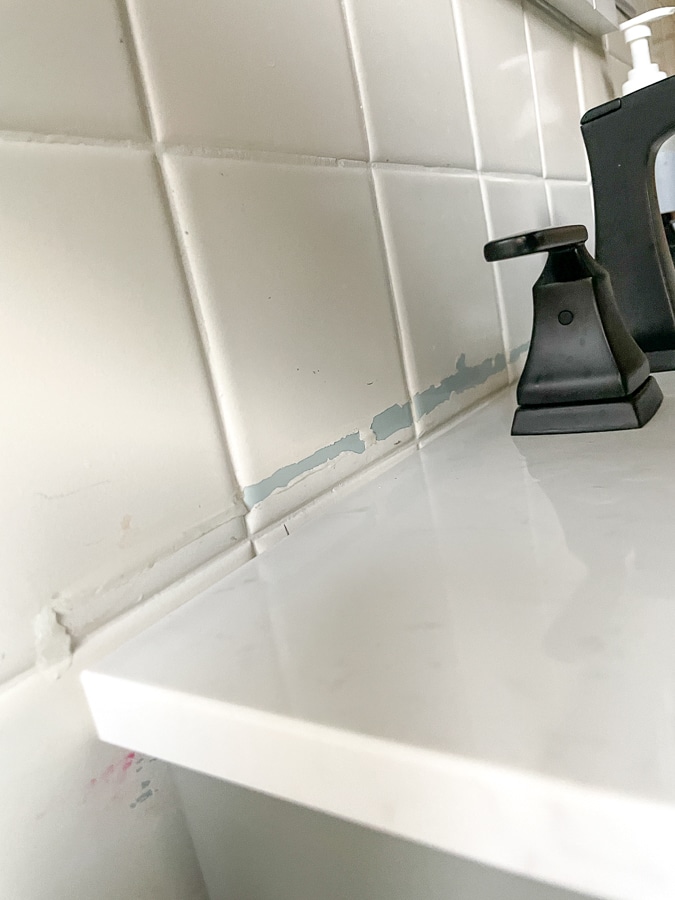 You can see that our bathroom tiles were once blue and were painted white when the previous owner updated the home. The old vanity’s silicone glue ripped the paint a little along the top edge. This is one of those “open a can of worms” things that we didn’t anticipate. But also, once we got the new white quartz vanity top installed, the tiles looked SO YELLOW. We knew a fresh coat of paint was the next step.
