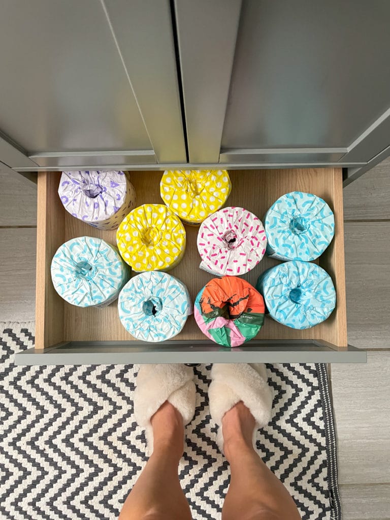 I much prefer to use a drawer to store extra Who Gives A Crap toilet paper than have a tower of rolls in the cabinet.