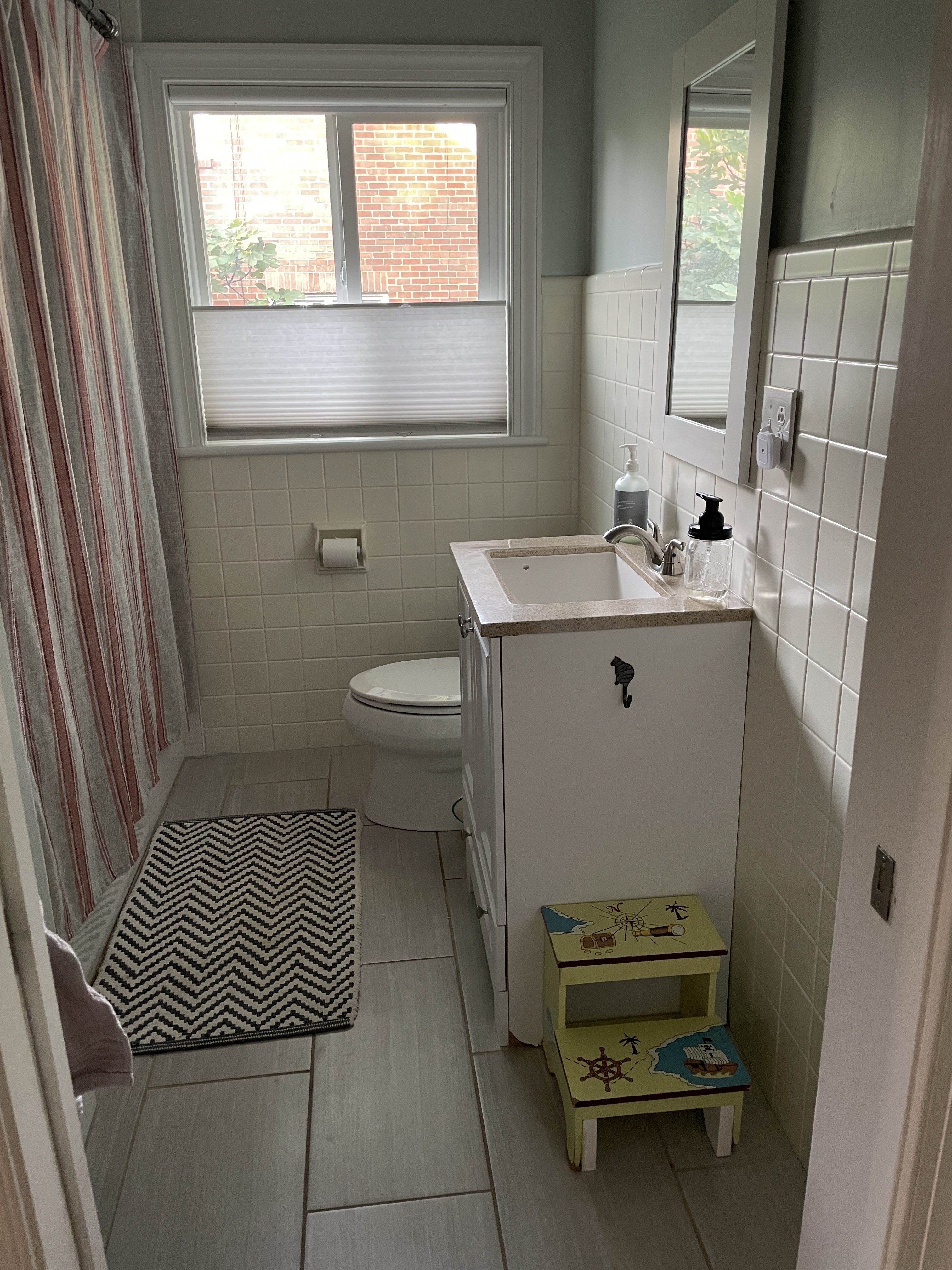 Looks great! Did you sand the tile before you painted it? Sounds like maybe. Also, where do you store toothbrushes etc? Nice to see a practical renovation that didn’t redo everything.