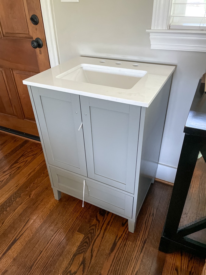 We actually bought another vanity for this room first. When it arrived, we knew we’d made a mistake because the vanity top wasn’t attached to the base, and the whole thing was assemble yourself. So we sent it back and looked for something already built that had more of a furniture feel. We looked at tons and tons of varieties and just couldn’t decide! We debated white bathroom vs. pop of gray vs. bold navy with gold hardware and went in circles for weeks.