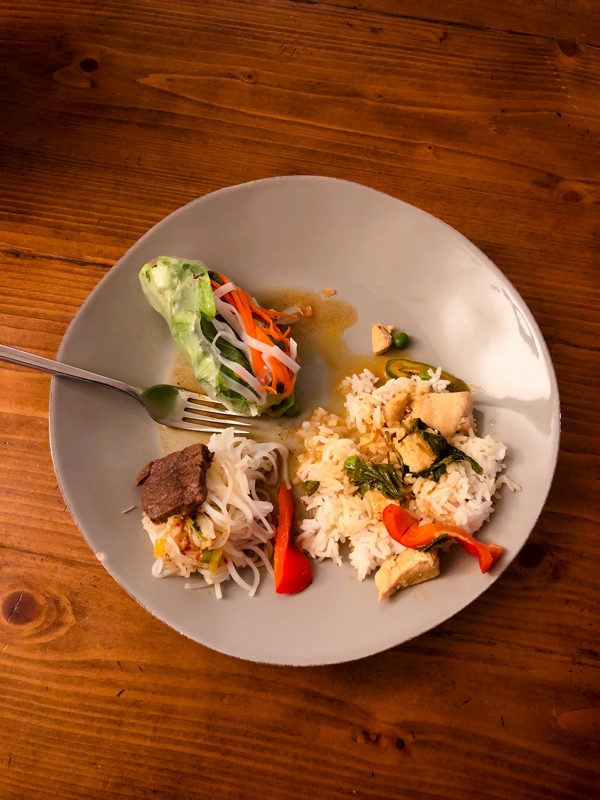 Fresh rolls, spicy beef noodles, panang curry.
