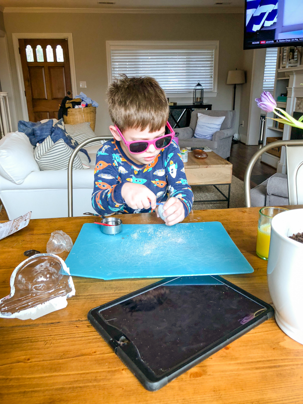 The House Fairy brought Mazen a fossil dino egg for a few days worth of good manners and choices. He started chipping away at breakfast. Protective eyewear required! : )