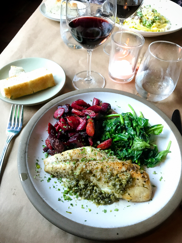 We enjoyed some wine, and this snapper with roasted roots and sautéed spinach. Very delicious!