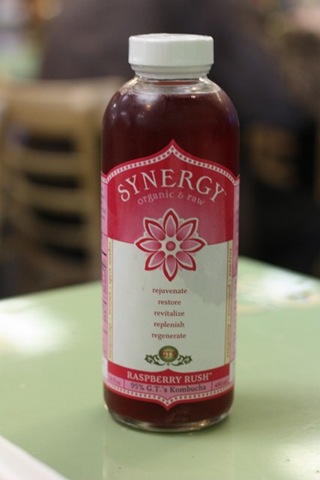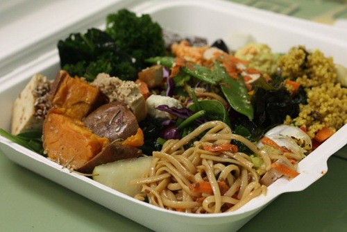 I got a big salad with all the fixins – kale salad, tofu x2, sweet potato, olives, noodles, grapeleaf, veggies, sprouts, garbanzos, blue cheese, curried quinoa, and more. It was awesome!!