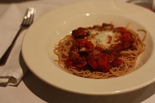 Whole wheat thin spaghetti with a semi-homemade mushroom + pepper spiked Ragu. Plus tomatoes and leftover pepperoni. And parm chez.