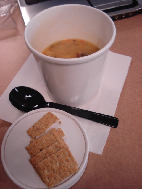It’s fun to have all kinds of snacks available around campus. I just wanted something small and warm – soup was perfect! I got a cup of portabello mushroom and had the last of my kashi crackers at 3:30: