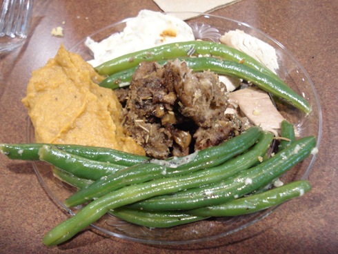 Mashed potatoes, turkey, green beans, orange scented sweet potatoes and apple-sage stuffing.
