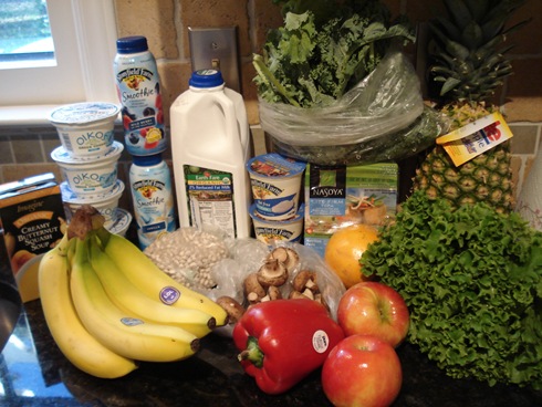 NOT INCLUDED: some ground meat for Thursday’s dinner (the husband is bringing it home fresh) plus a huge butternut squash and some sweet potatoes, which I am getting at Trader Joe’s on Wed. because they were too expensive at the stores I visited today. I’ll add the mid-week.