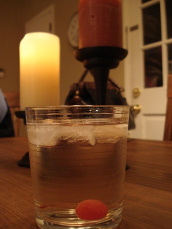 Karen came over for dinner and brought her French Beef Casserole and some kale. We all started with some drinks – mine was mostly diet tonic with a splash of Triple Sec and Chambord plus a cherry!