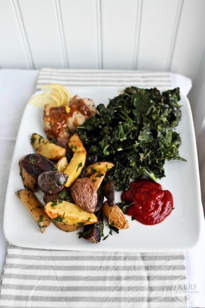 And finally, lemon-thyme chicken thighs with kale chips and roasted potatoes. Loads of ketchup!