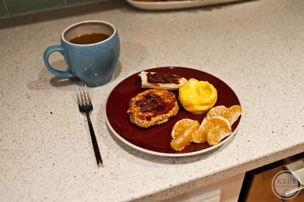 The next day I had a leftover pancake with some chocolate peanut butter on top. The funky egg was cooked in the microwave (a failed experiment).