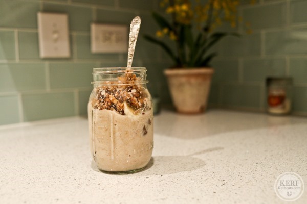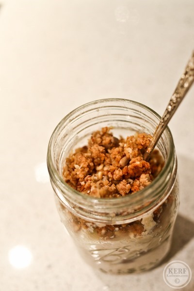 Oats in a jar! Long time, no see. This was actually oat bran, which is why it looks so uniform. Mazen likes oat bran more than oatmeal because of its smaller texture, so this is what we eat nowadays! I topped the banana-y mixture with some Cville Cluster granola. Yum yum.