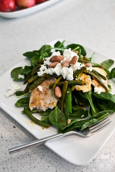 Another salad – this time topped with leftover trout, leftover green beans, goat cheese, almonds and Tessemae’s dressing