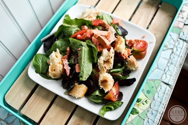 Matt brought home a loaf of Cheddar Garlic, which made an unbelievably delicious salad topper along with hot smoked salmon and garden tomatoes!